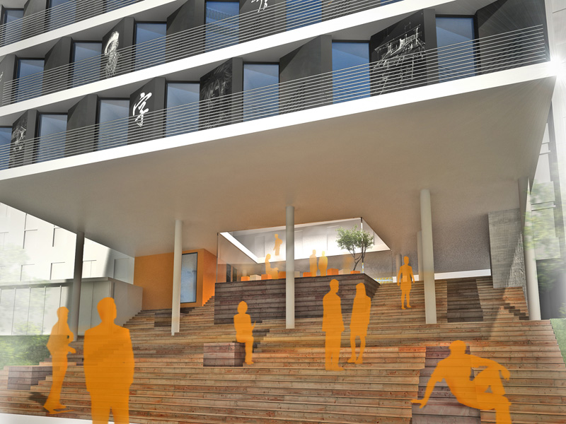 Das Baugrundstück liegt am Anfang beziehungsweise am Ende des Campusgeländes auf der Haupterschließungsachse. Um bestehende Blickbeziehungen nicht einzuschränken, soll der Baukörper aufgeständert werden. Das Erdgeschoss soll seiner Funktion als Verbindungsachse und Eingangsportal des Hochschulgeländes gerecht werden, indem den Studierenden eine großzügige Freitreppe als Freiraumfläche zur Verfügung steht, die vielfältige Verweilmöglichkeiten bietet. Im Zentrum, dem Gebäudekern, befindet sich der Kommunikationsmittelpunkt: das Studentencafé. Der wettergeschützte Freibereich um das Café herum kann als Event- und Ausstellungsfläche genutzt werden. In der Verlängerung der Erschließungsachse besteht eine Option zur nachhaltigen Gebäudeerweiterung auf dem bestehenden Parkplatz.